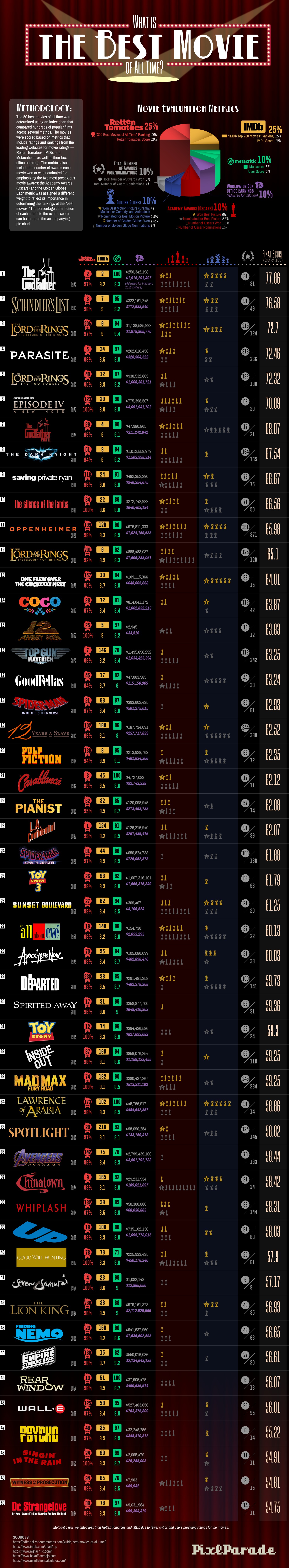 Our PixlParade team set out to find the answer to that question. Rather than just throwing together another random top 50 list, we took our time to really dig into hundreds of popular films. We looked at ratings from trusted sites like Rotten Tomatoes, IMDb, and Metacritic. And we didn’t stop there; we also factored in inflation-adjusted box office earnings and the number of major awards each film won or was nominated for. Each factor was given a different level of importance to help us rank the movies fairly. The result? The higher the film’s final score, the higher it placed on our list. So, check out which movies made the list and which film claimed the top spot!